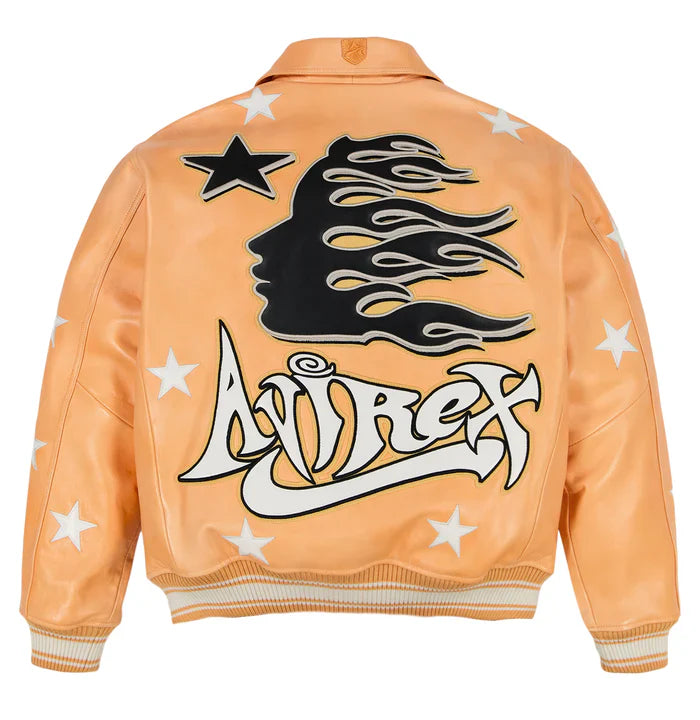 This premium leather bomber showcases a Hellstar graphic on the back, allover star embroidery, and Avirex branding on the front for a bold statement.