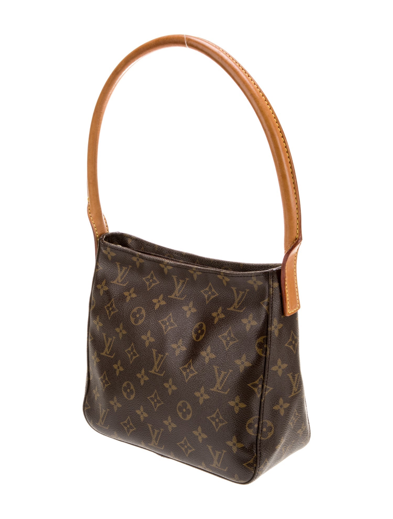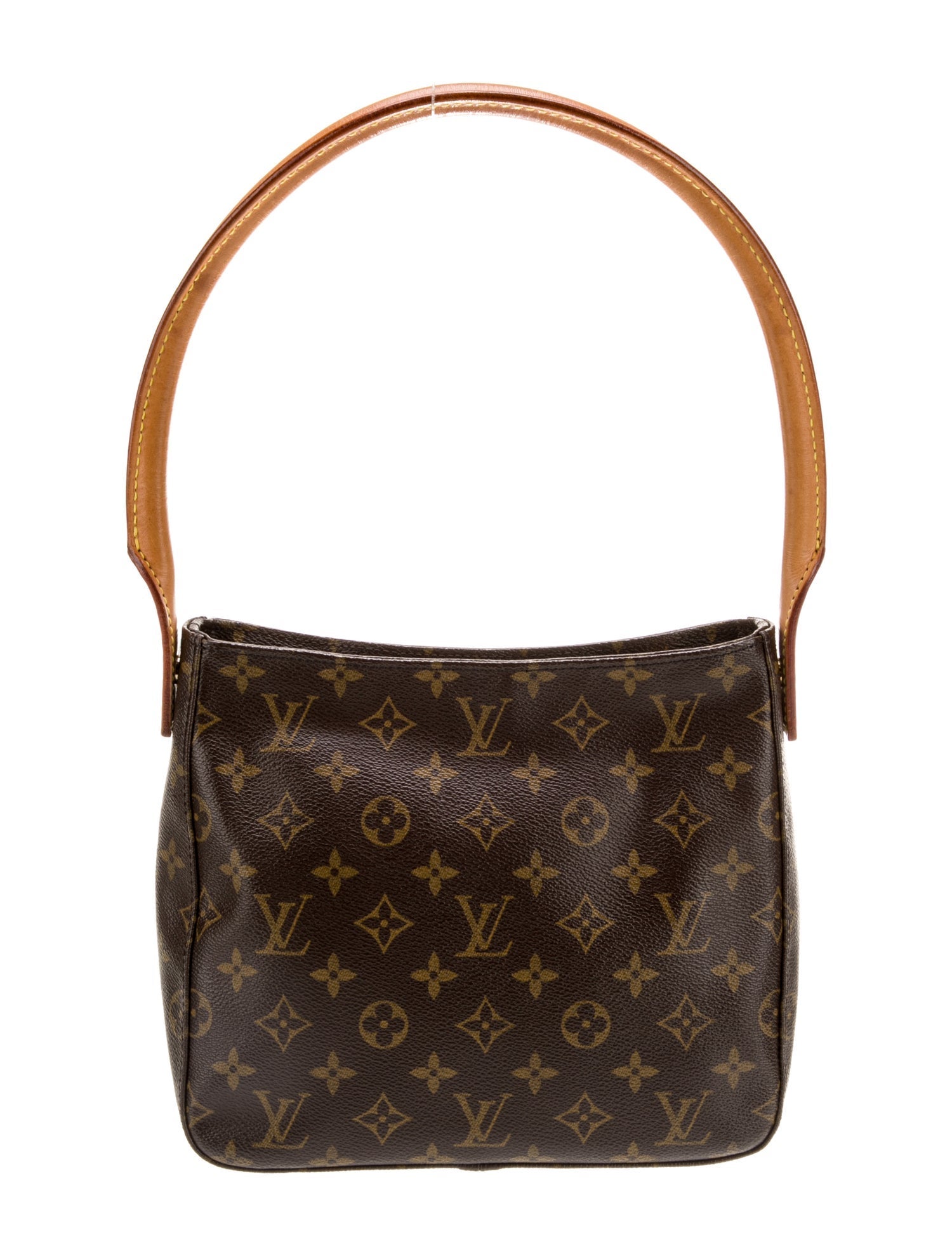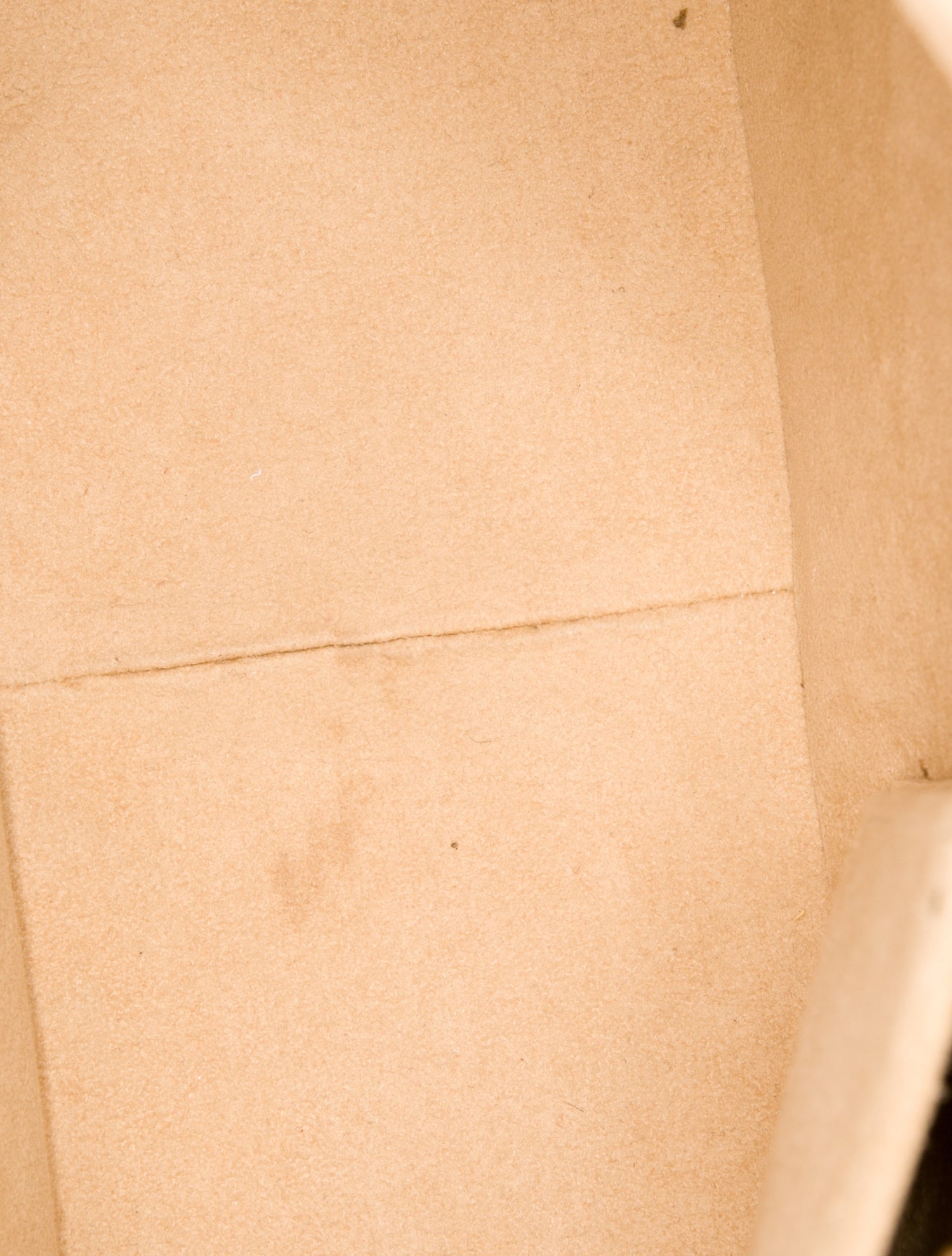 - Slightly misshapen strap; minor wear and patina at strap; minor scratches at hardware; minor residue at interior; minor creasing and discoloration throughout.
