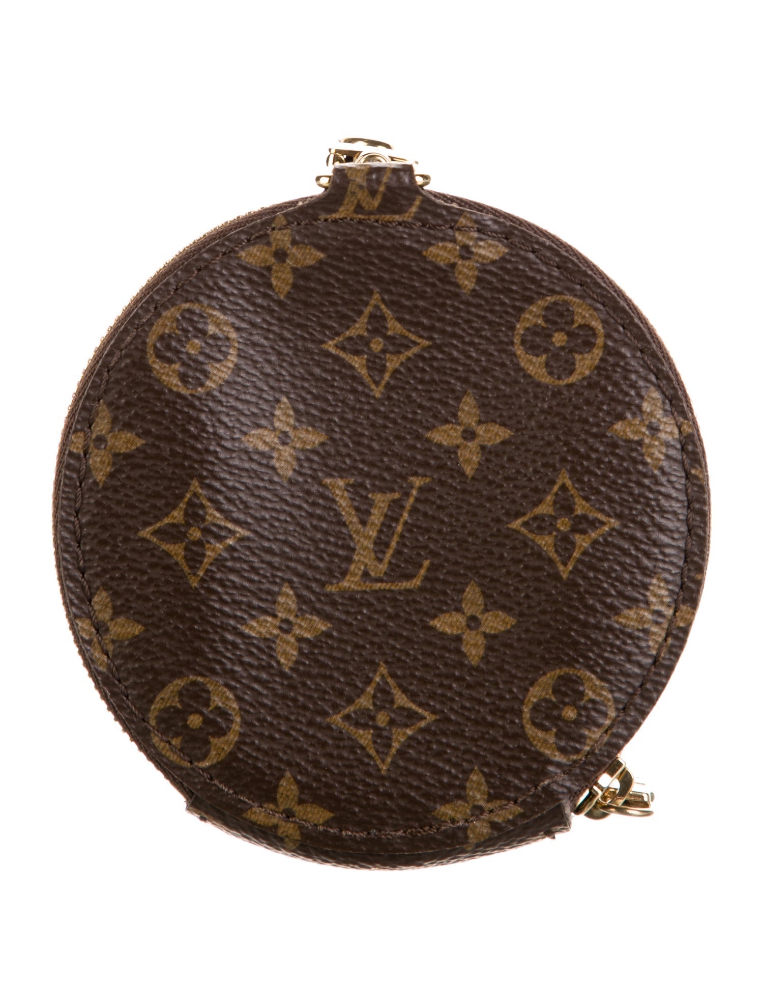 Ebene and tan coated canvas Louis Vuitton Multi Pochette Accessories Round Coin Purse featuring signature Monogram motif throughout, black leather lined interior with Brass hardware, exposed zip closure and single clasp at top.