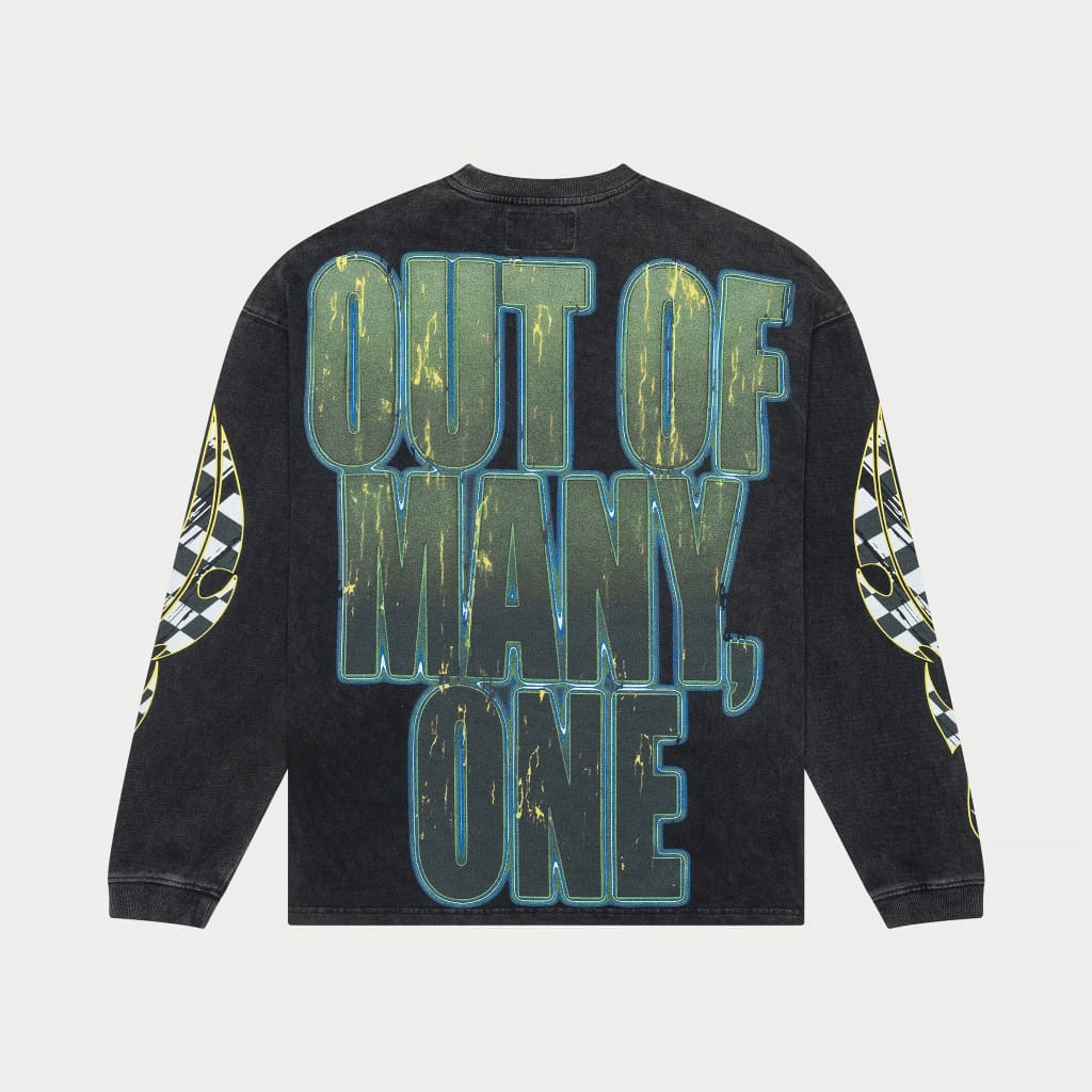 This long sleeve T-Shirt is crafted from 10oz mid-weight washed fabric and features a striking digital art piece. With a limited run of 555 units, it comes with a numbered tag to confirm its authenticity.