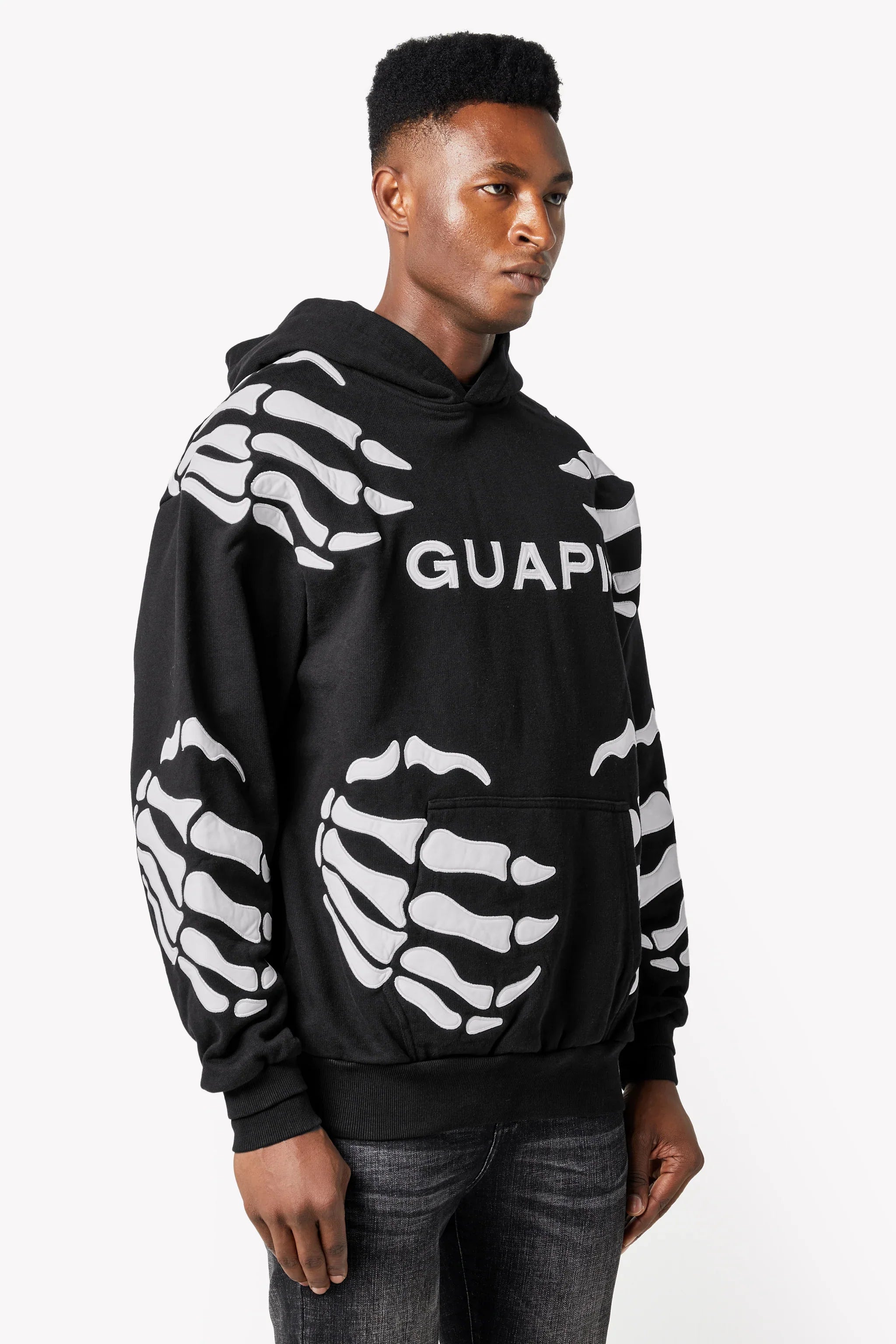 The Obsidian Black Hell Dragger Hoodie is a bold statement piece crafted for those who embrace streetwear with edge. Featuring striking white leather patches stitched across the front, sleeves, and back, the hoodie showcases a skeletal-inspired design that contrasts sharply against the deep black base. The GUAPI logo on the chest, meticulously stitched as a leather patch, delivers a sleek, elevated branding touch. On the back, the iconic GUAPI emblem, also made from leather, amplifies the aesthetic appeal, making this hoodie a standout from every angle.
