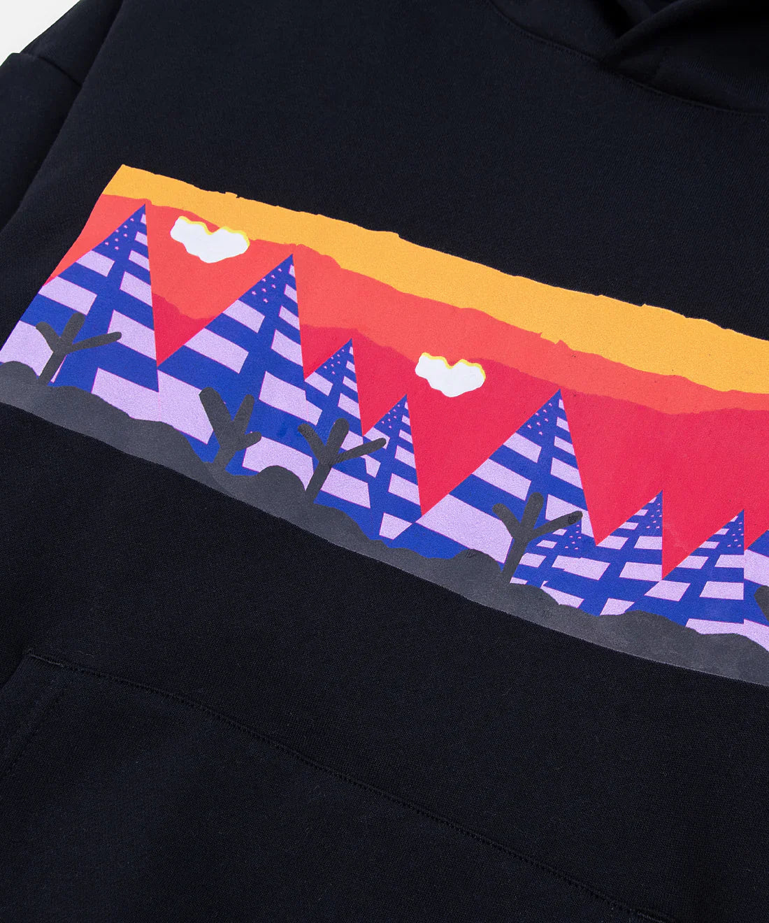 The Landscape Hoodie is crafted with a cotton and polyester blend fabric. It has circle knit ribbing at the sleeve cuffs and waistband, a kangaroo pocket, and is complete with the chest-centered dream-like ‘landscape’ graphic.
