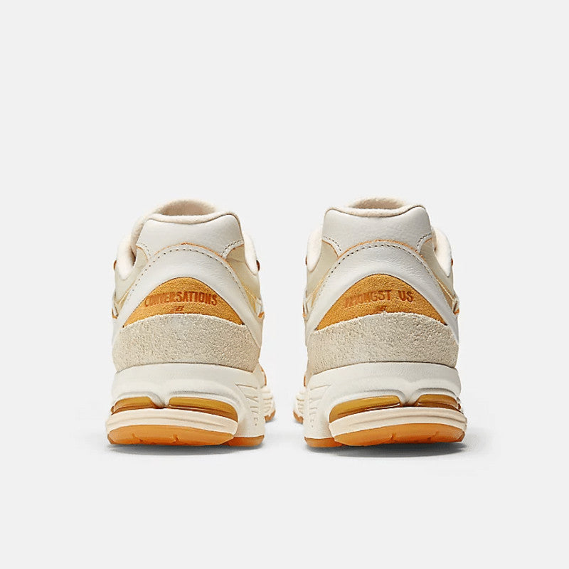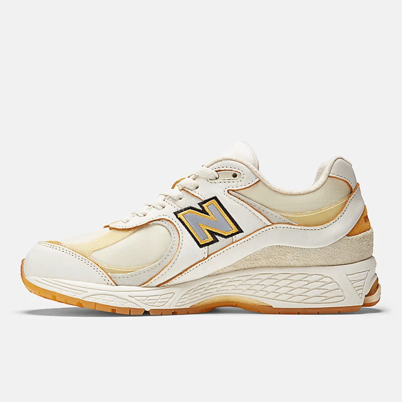 A "Sail"-coloured scheme covers both the base and overlays. The Joe Freshgoods x New Balance 2002R "Conversations Amongst Us" features a mix of regular leather and velvety suede. In between, some elements showcase brown hits, and a bright Abzorb and N-Energy midsole perfectly rounds out the clean look.