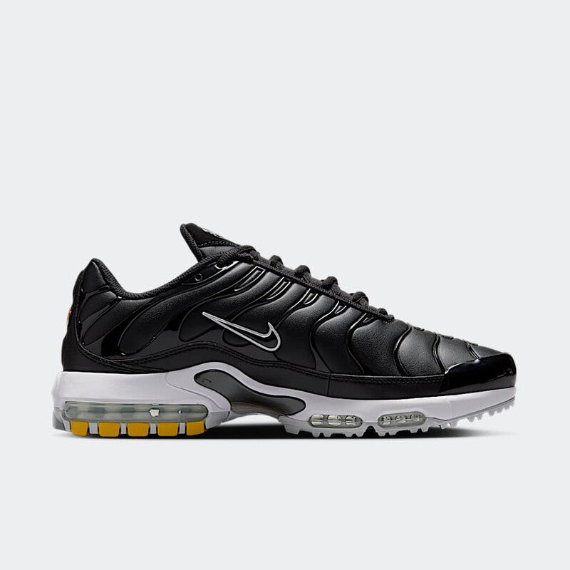 The Nike Air Max Plus Golf “Black Leather” combines the legendary design of the Air Max Plus with special features for golfers. The waterproof black leather upper provides a premium look and protects against rain at the same time.