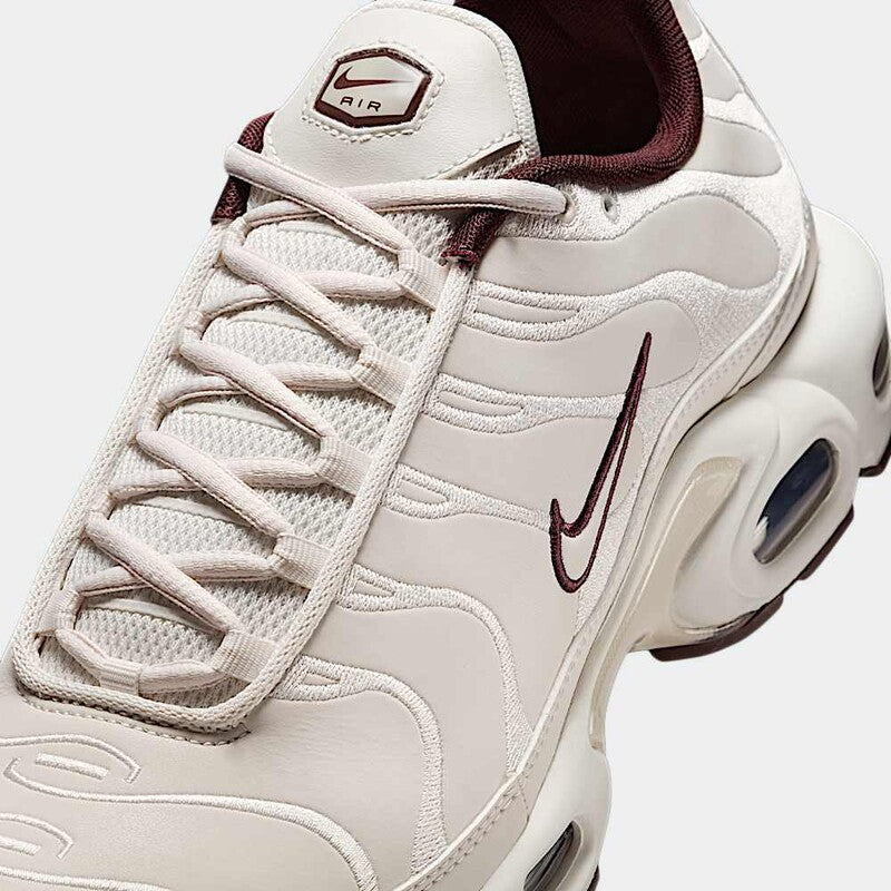 TLDR: Nike launches the Air Max Plus ‘Phantom/Light Bone’, a stylish version of the popular model. Instead of the typical TPU cage details, this version features embroidered wing patterns and a high-quality matt leather upper that gives the shoe a more sophisticated look. Wine red accents on the Swoosh, inner lining and outsole add subtle colour accents. The sneaker will be available on 25 February 2025 for €200 on Nike.com and at selected retailers.
