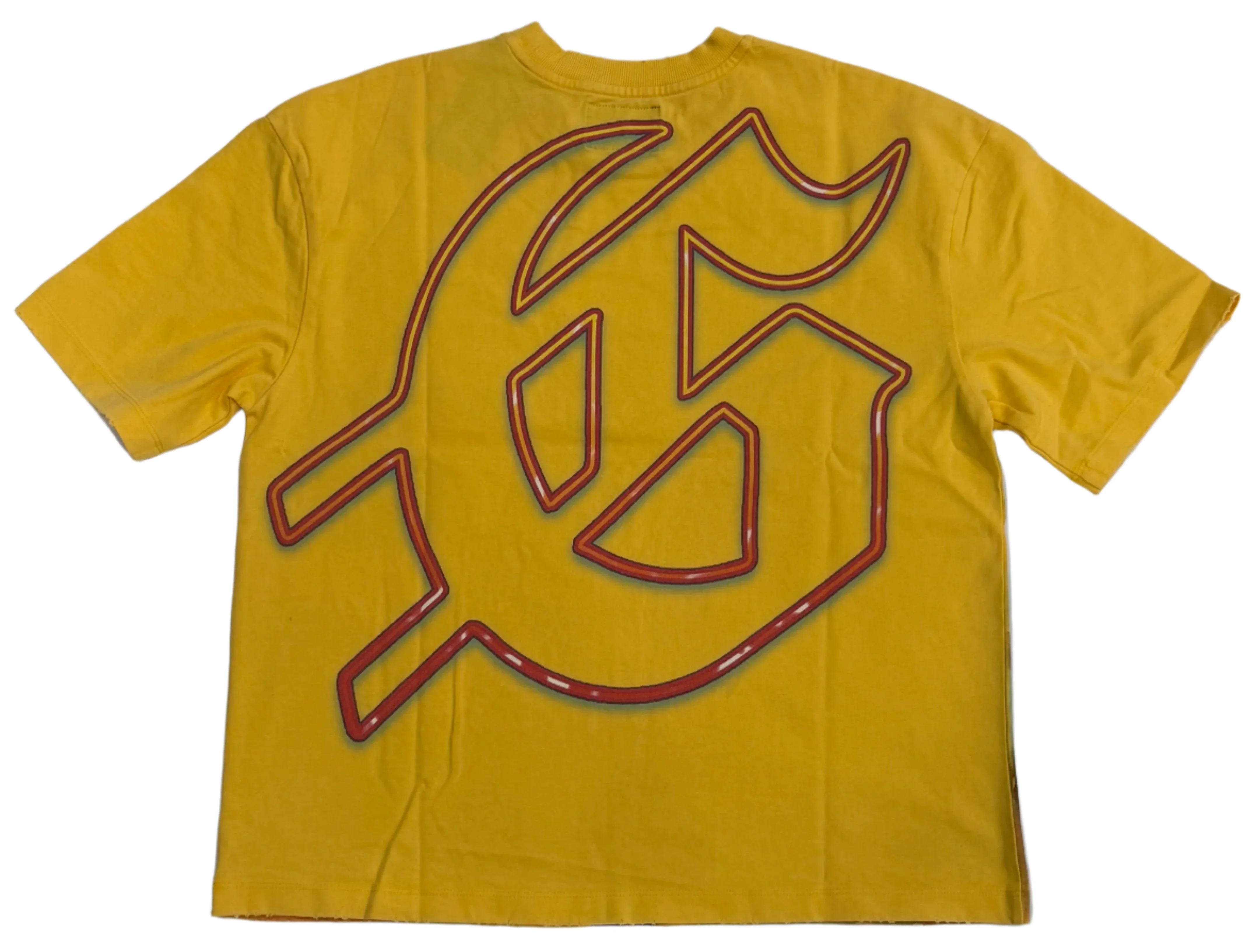 The Godspeed F1 Dreams (Yellow) t-shirt stands out with its bold design and elevated details. Crafted from 10oz mid-weight washed cotton fabric, it delivers both structure and comfort. The front features a vivid art piece that draws attention, enhanced with carefully placed stones around the crown for added dimension and visual impact. This t-shirt combines streetwear energy with artistic expression, making it a standout addition to any casual wardrobe.