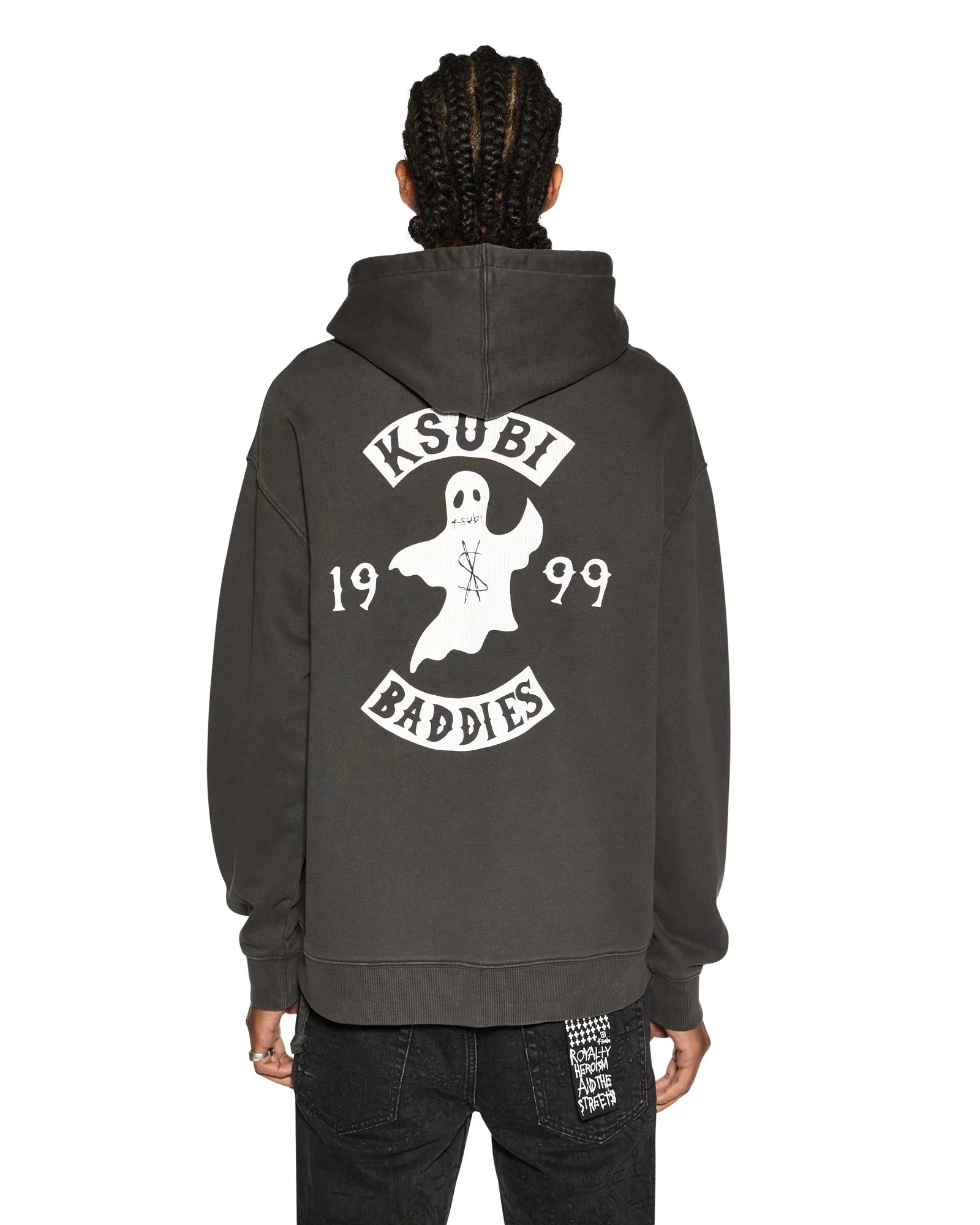 The Baddies Biggie Hoodie is an oversized fitted hoodie in a faded black wash. The front of the hoodie has an inverted Ksubi logo, drawstrings with metal hardware detail and signature rats tail. Made from a premium loopback fleece and finished with t-box Ksubi branding.