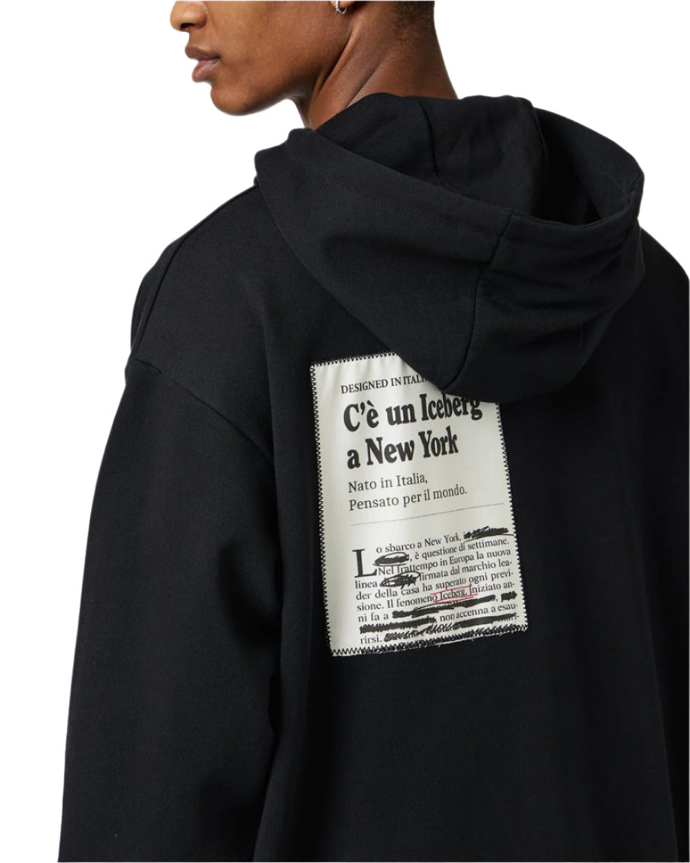 The Iceberg Relaxed Fit Newspaper-Inspired Cotton Hoodie offers a blend of comfort and contemporary style. Crafted from soft 100% cotton, this relaxed fit hoodie features a unique all-over print inspired by newspaper articles. An exclusive Iceberg jacquard label is positioned on the bottom of the sleeve, adding a distinctive pop culture reference to the design. Ideal for those who want casual comfort combined with a bold, standout aesthetic.